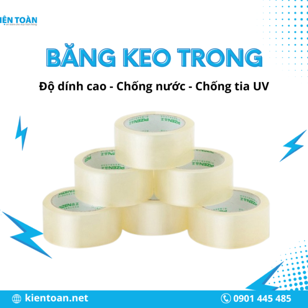 Băng keo trong là loại băng keo phổ biến, dùng để đóng gói, bảo vệ, cố định vật phẩm trong nhiều lĩnh vực từ gia đình, văn phòng đến công nghiệp. Sản phẩm được ưa chuộng nhờ độ trong suốt, khả năng dính tốt, dễ sử dụng và không để lại keo trên bề mặt. Tại Kiện Toàn, chúng tôi cung cấp băng keo trong đa dạng kích thước và chiều dài, đáp ứng mọi nhu cầu khách hàng.