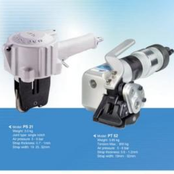 Máy đóng đai thép khí nén model PT52 và PS21 dùng để căng dây đai thép và bấm dây đai thép trong đai kiện hàng .